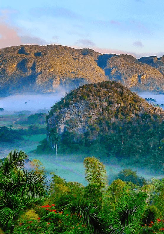 Valles y montañas conforman un paisaje donde la mirada se pierde entre tanta belleza. Guajaibón, en la Sierra del Rosario, elevación de unos 700 metros de altura sobre el nivel del mar, deviene inspiración de poetas y científicos.